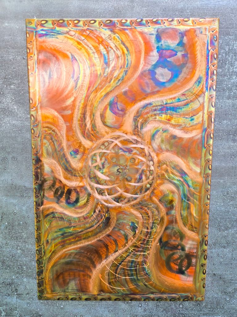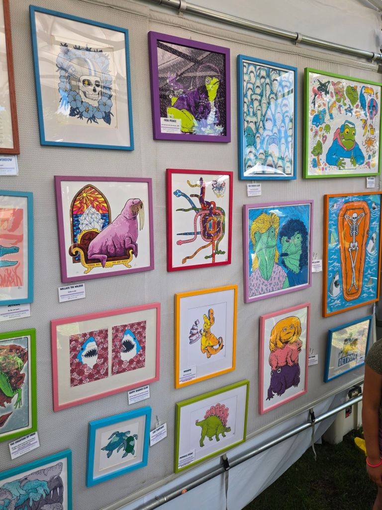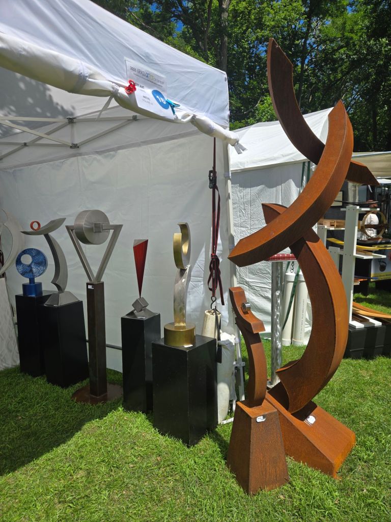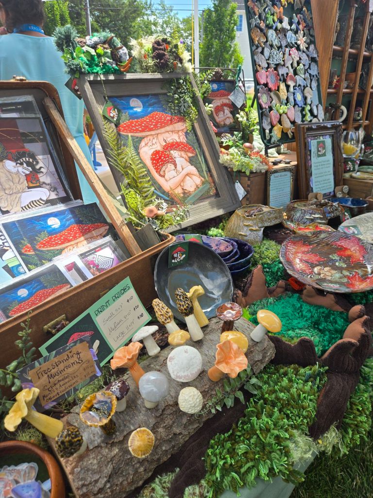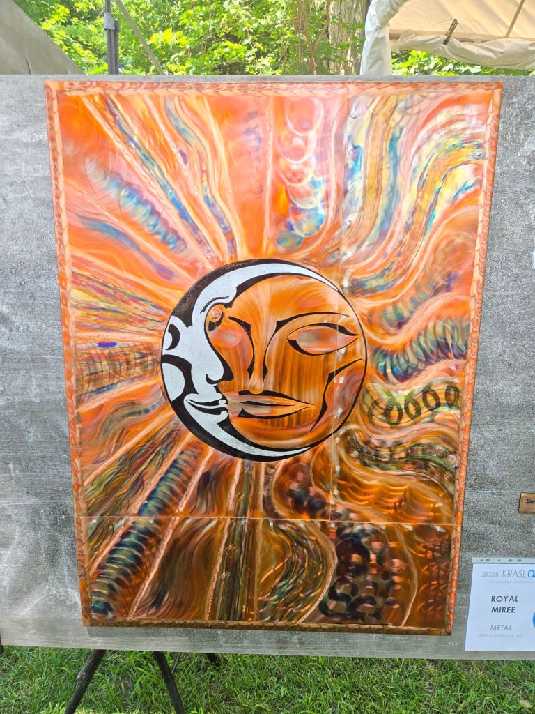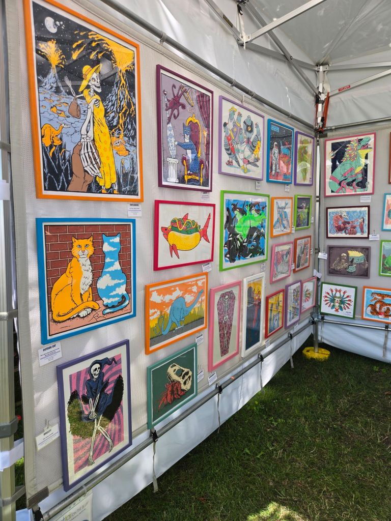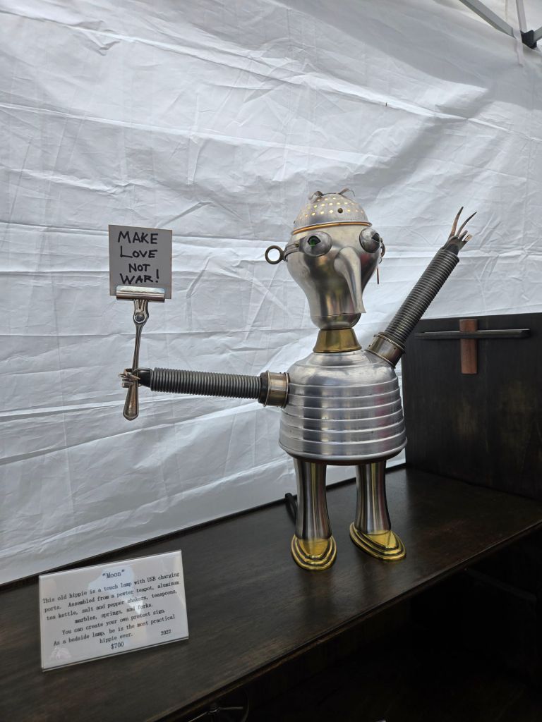 There are so many types of artwork being featured from oil painting and leather goods, to screen printing, blown glass, and copper engraving! I even learned about a new (to me) form of pottery that involves a live fire while being worked (as opposed to being worked and then set in a kiln). Thanks, Michelle Stroud Ceramics!